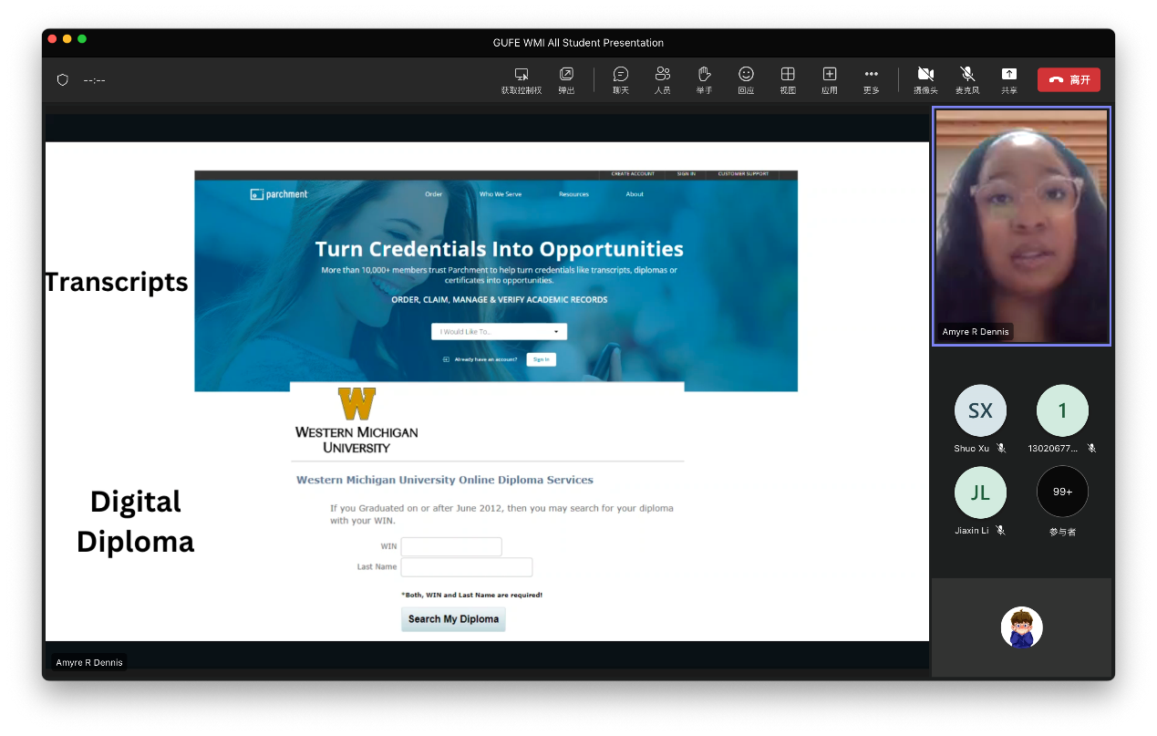 美国西密西根大学教授Yumi 和 Amyre R Dennis对西密西根大学的外方系统申请和期末录取、转让信用评估、员工管理、GUFE WMI学术咨询、课程和时间表、成绩单、复读课程、毕业审核流程以及毕业证书等相关内容做了总体的介绍。讲座最后,Amyre R Dennis对同学们的注册申请、学位证获取、成绩单等方面的内容进行解答。
